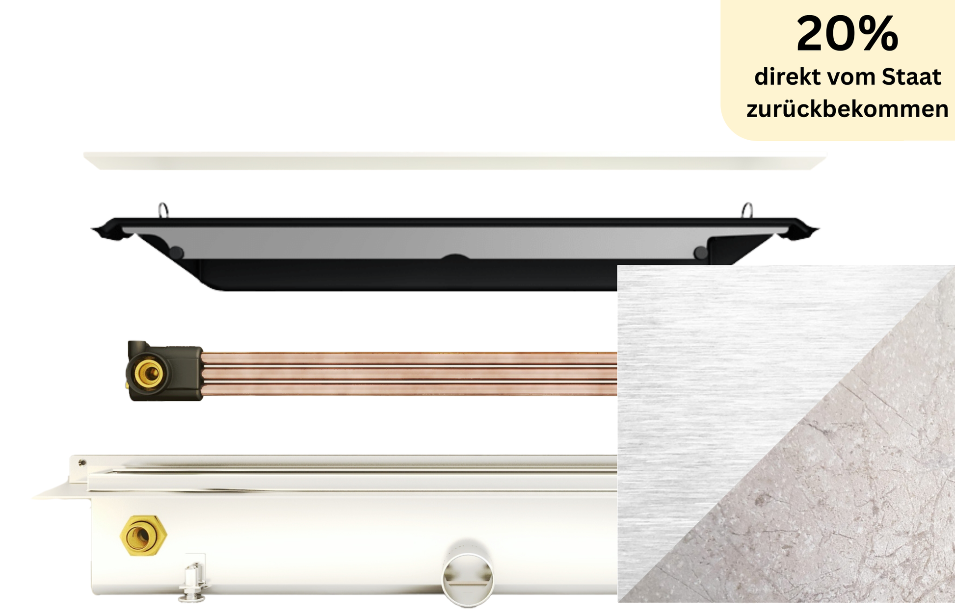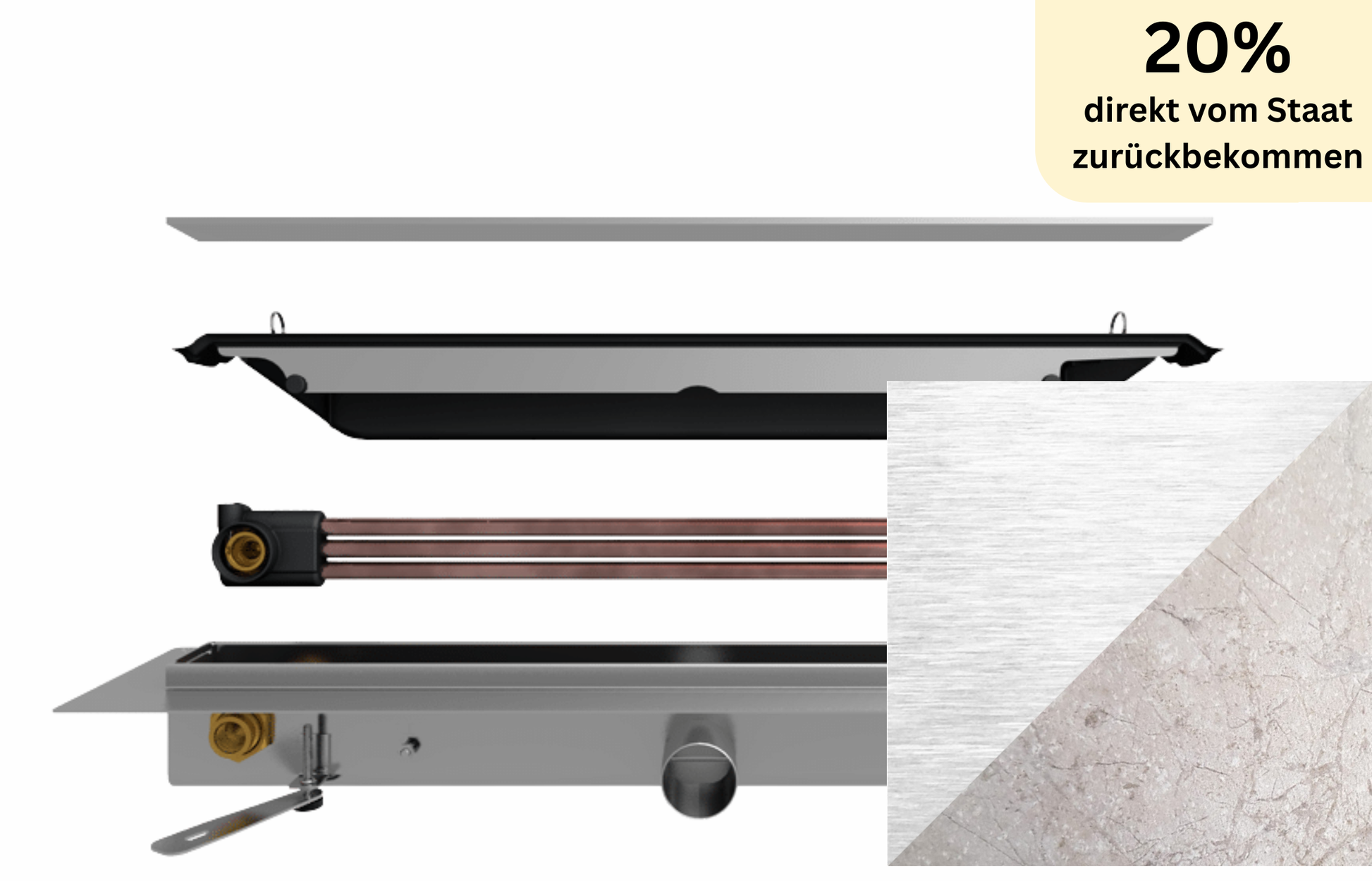 Duschrinne Joulia 3-Rohr für exklusive Bodenbeläge (37% Wirkungsgrad)